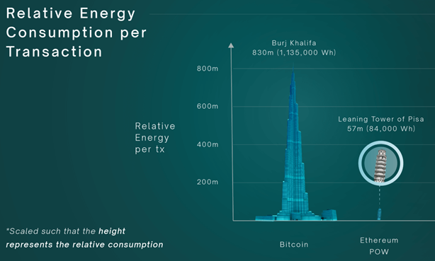 Indeed, Ethereum is expected to complete a long-awaited PoS upgrade called ‘the Merge’ on 15 September 2022. This will reduce the network’s carbon footprint by 99.95%, transforming it’s impact per transaction from that of the Leaning Tower of Pisa to a screw… 👇 This represents an ongoing trend toward blockchain organisations taking responsibility for their environmental impact.