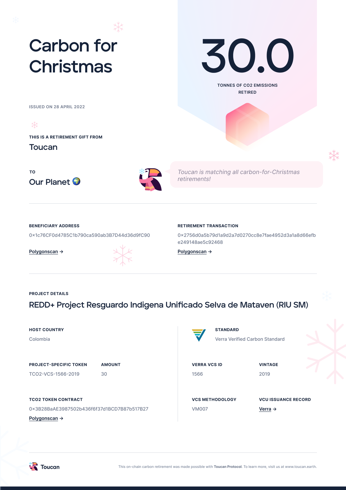 Retire carbon credits on-chain and receive a giftable Christmas-themed retirement certificate. The process is simple and takes minutes — instructions below. The best part? Toucan will match all NCT carbon retirement gifts as an extra present for the planet 💚🌏