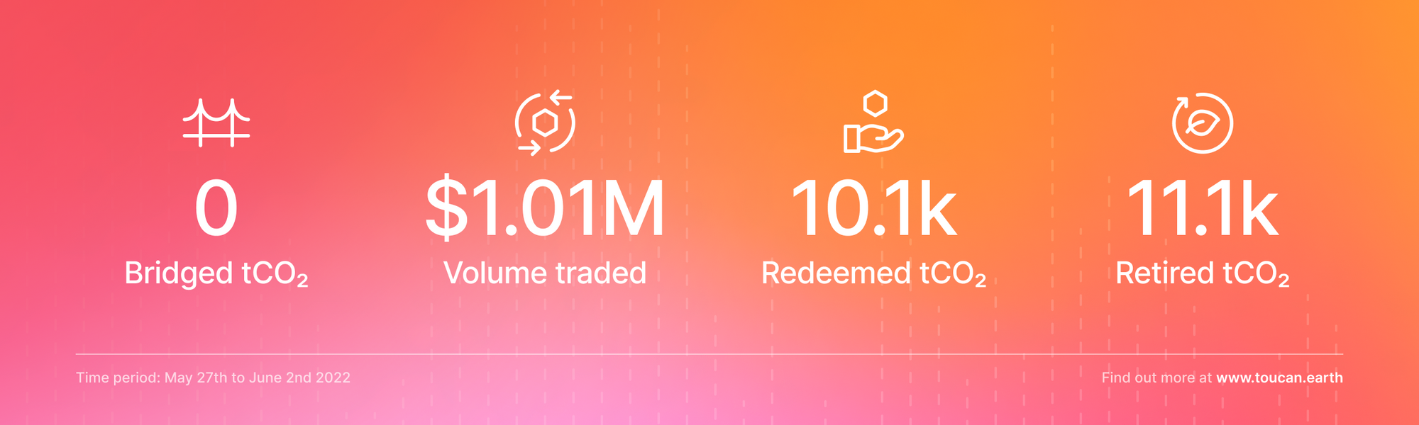 Toucan Protocol is building carbon market infrastructure to finance the world's best climate solutions. These are our on-chain stats from 31.05- 06.06.22: