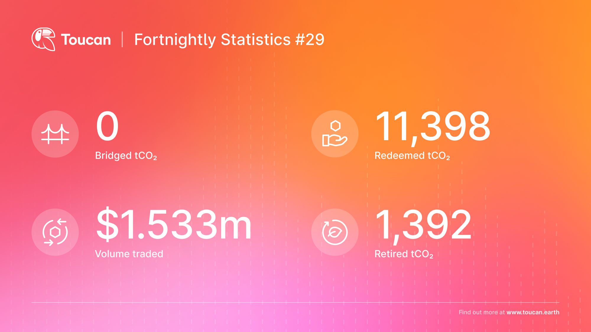 Toucan Protocol is building carbon market infrastructure to finance the world's best climate solutions. These are our on-chain stats from 23.08- 05.09.22:
