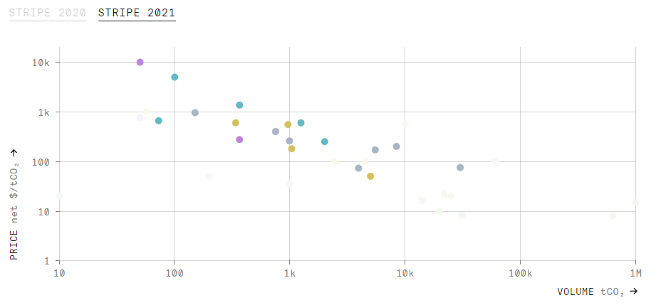 CarbonPlan has been building a public database of Stripe and Microsoft's carbon removal purchases since 2020. This recent article explores trends emerging from analysis of Stripe's 2021 credit procurement.
