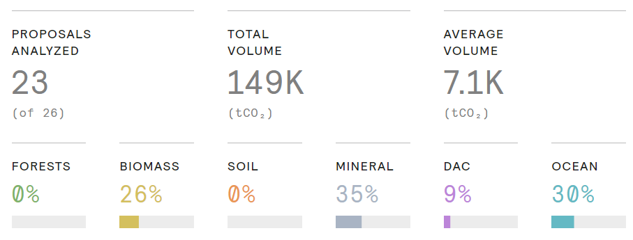 CarbonPlan analyzed 23 of 26 project proposals, accounting for 149,000 tonnes of CO2 with an average volume of 7,100 tonnes.