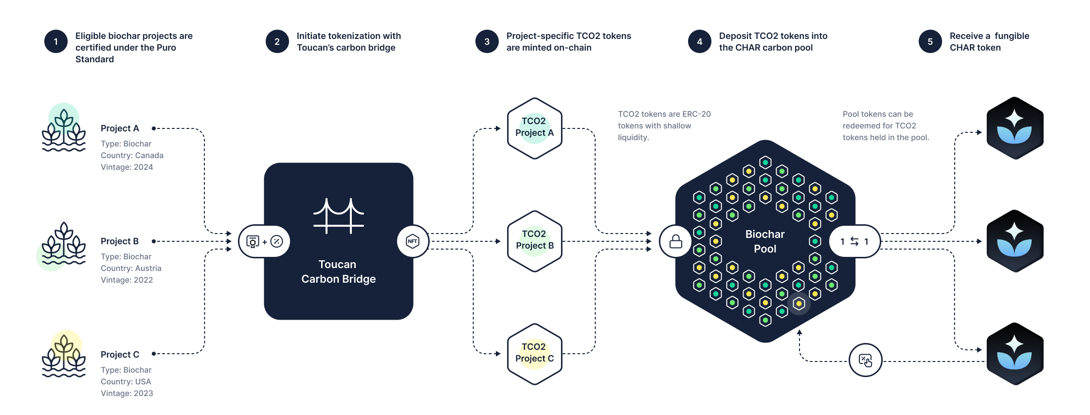 It begins with tokenization, in which users bring carbon assets from connected source registries such as Puro.earth onchain. Tokenized credits (TCO2s) are then minted on a 1-1 basis, where each TCO2 represents one tonne of carbon removed from the environment.