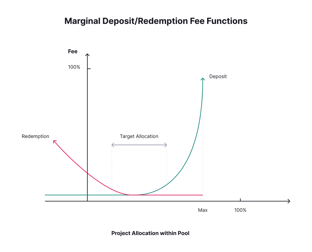To address this, Toucan and its launch partner, Neutral, designed a pool health adjustment module. The system applies dynamic fees to deposits and redemptions, promoting increased project TCO2 mix and enhancing the pool's overall health and attractiveness.